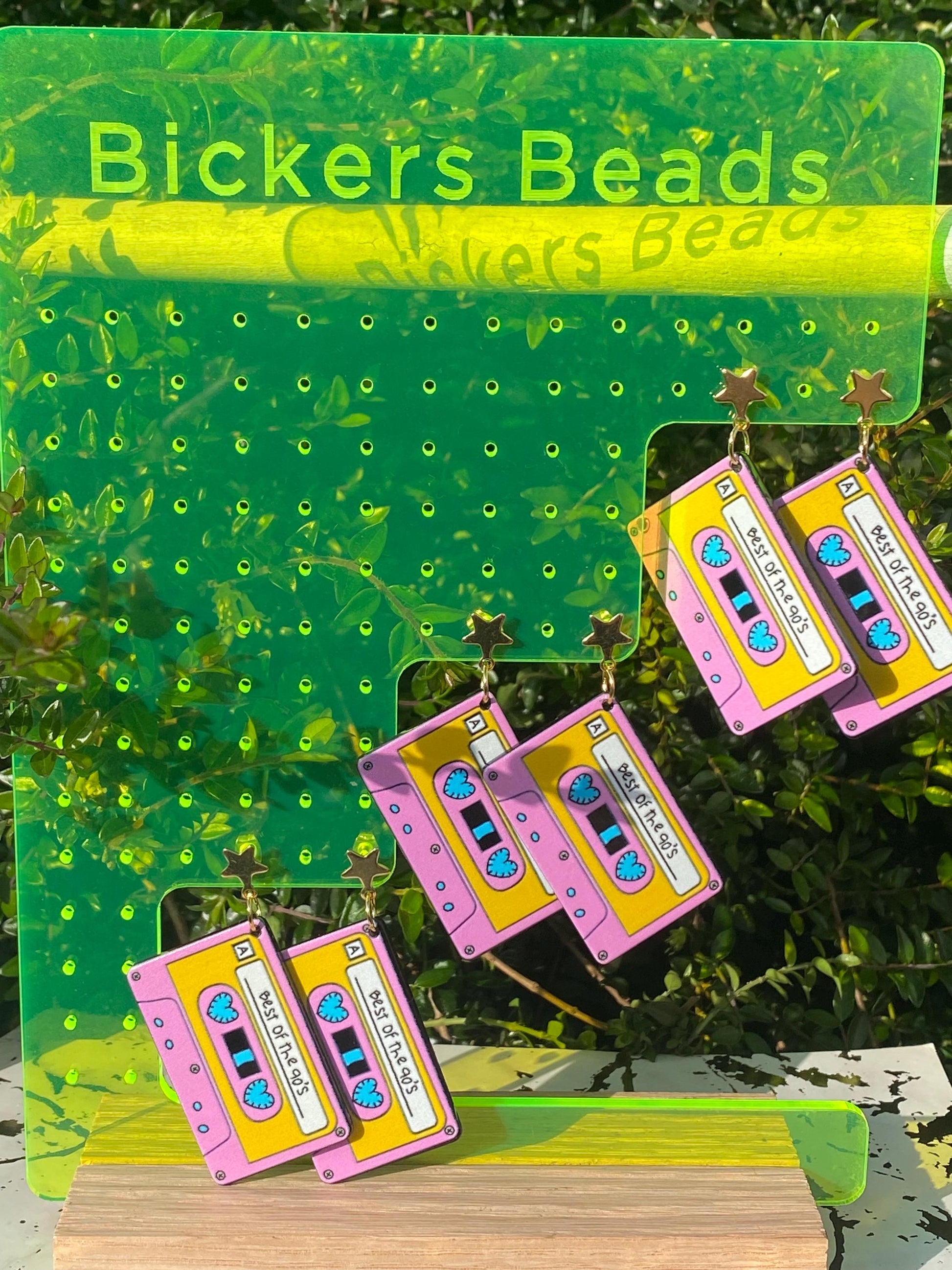 Take a trip down memory lane with these vibrant and playful cassette tape earrings!