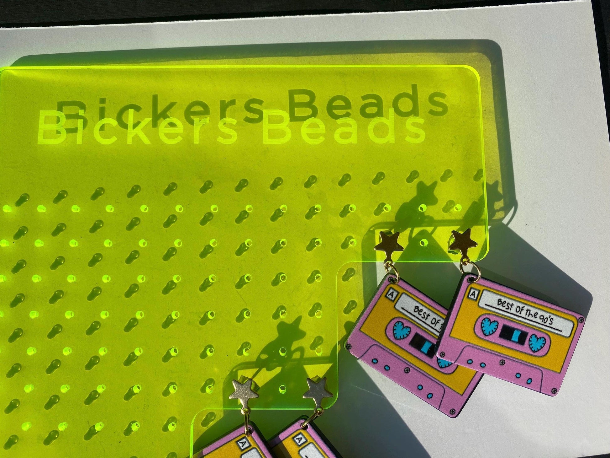 Details: Design: 90’s Cassette Tape with “Best of the 90’s” label Colors: Pink, Yellow, Aqua, Black Stud Material: Stainless Steel with Gold Finish Earring