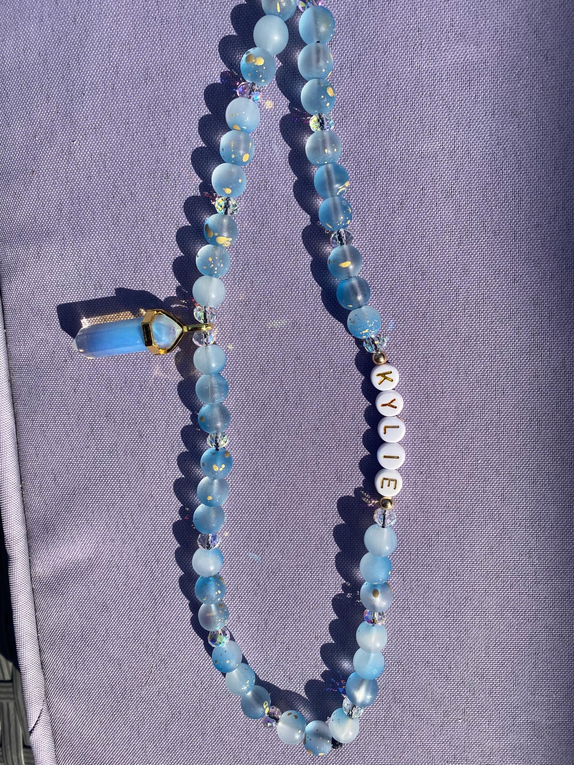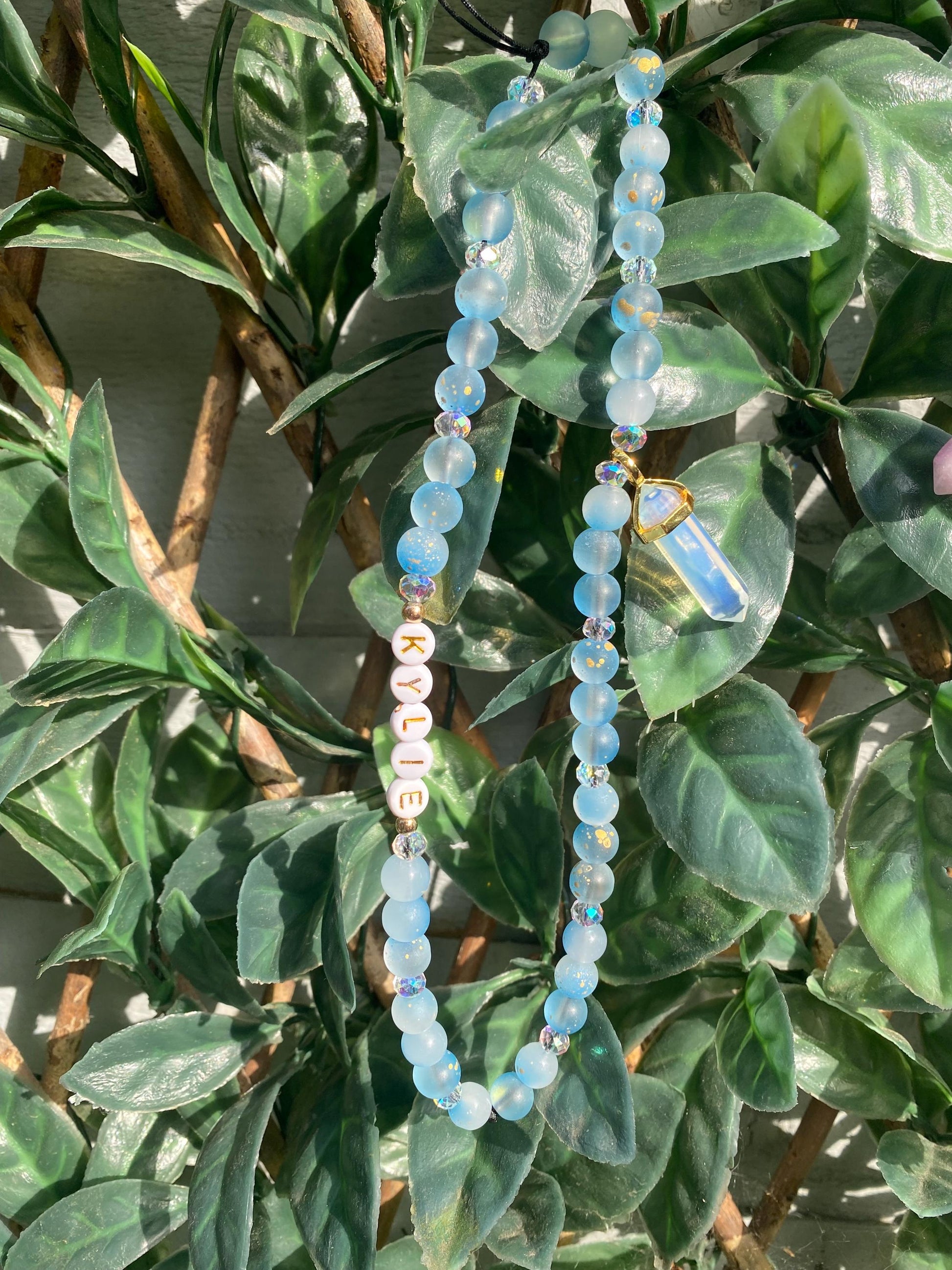🔮 Blue Charm – “Kylie” Vibe Cool, ethereal, and high-vibe. This charm features dreamy blue frosted beads with sparkling crystal accents, plus a stunning pointed opalite pendant that glows like moonlight. For the chill, intuitive soul who loves ocean hues and soft energy.